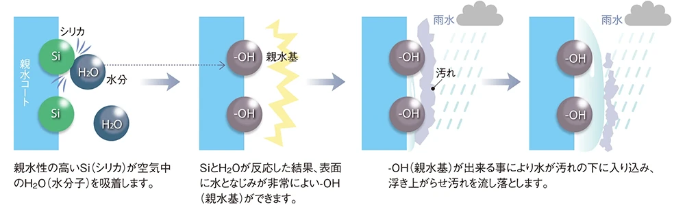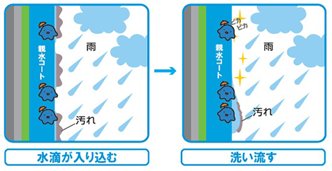 親水コートの表層は水になじみやすい親水基に覆われています。雨が降れば、親水基が汚れとの間に雨水を入り込みやすくするため、壁に付着した汚れが浮き上がり、雨水と一緒に洗い流します。