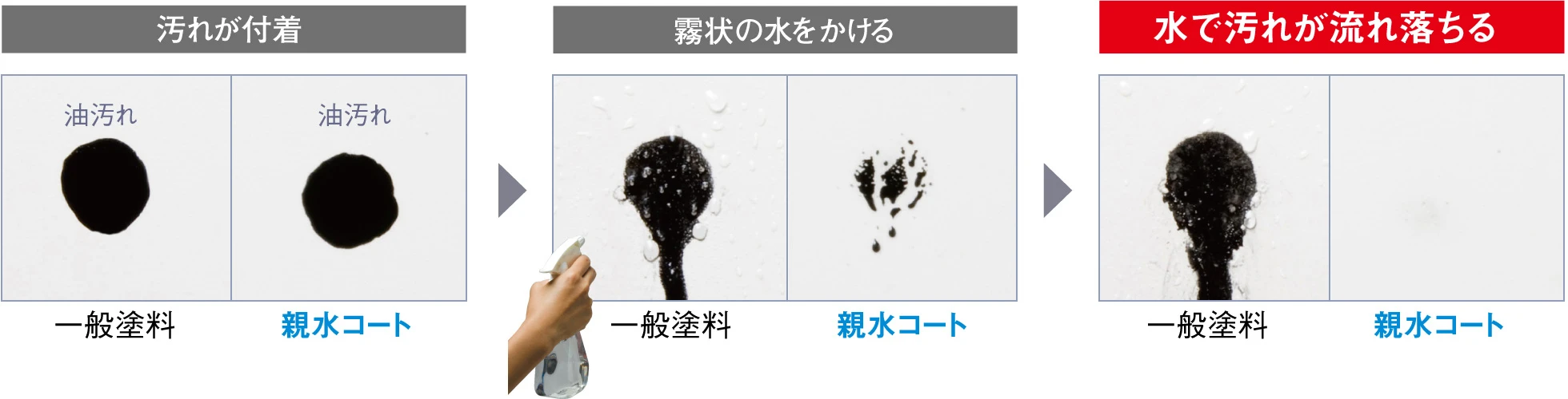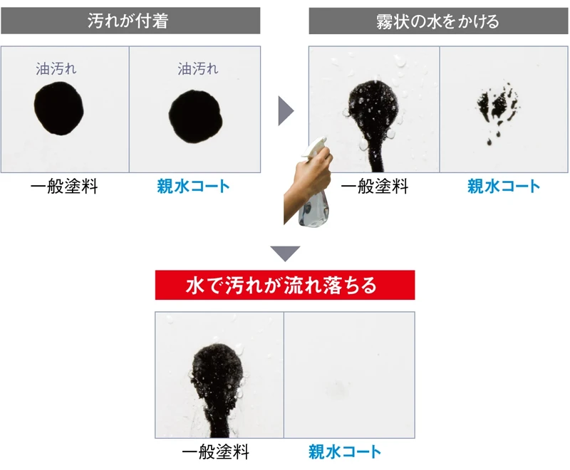 親水コートの表層は水になじみやすい親水基に覆われています。雨が降れば親水基が汚れとの間に雨水を入り込みやすくするため、壁に付着した汚れが浮き上がり、雨水と一緒に洗い流してくれます。